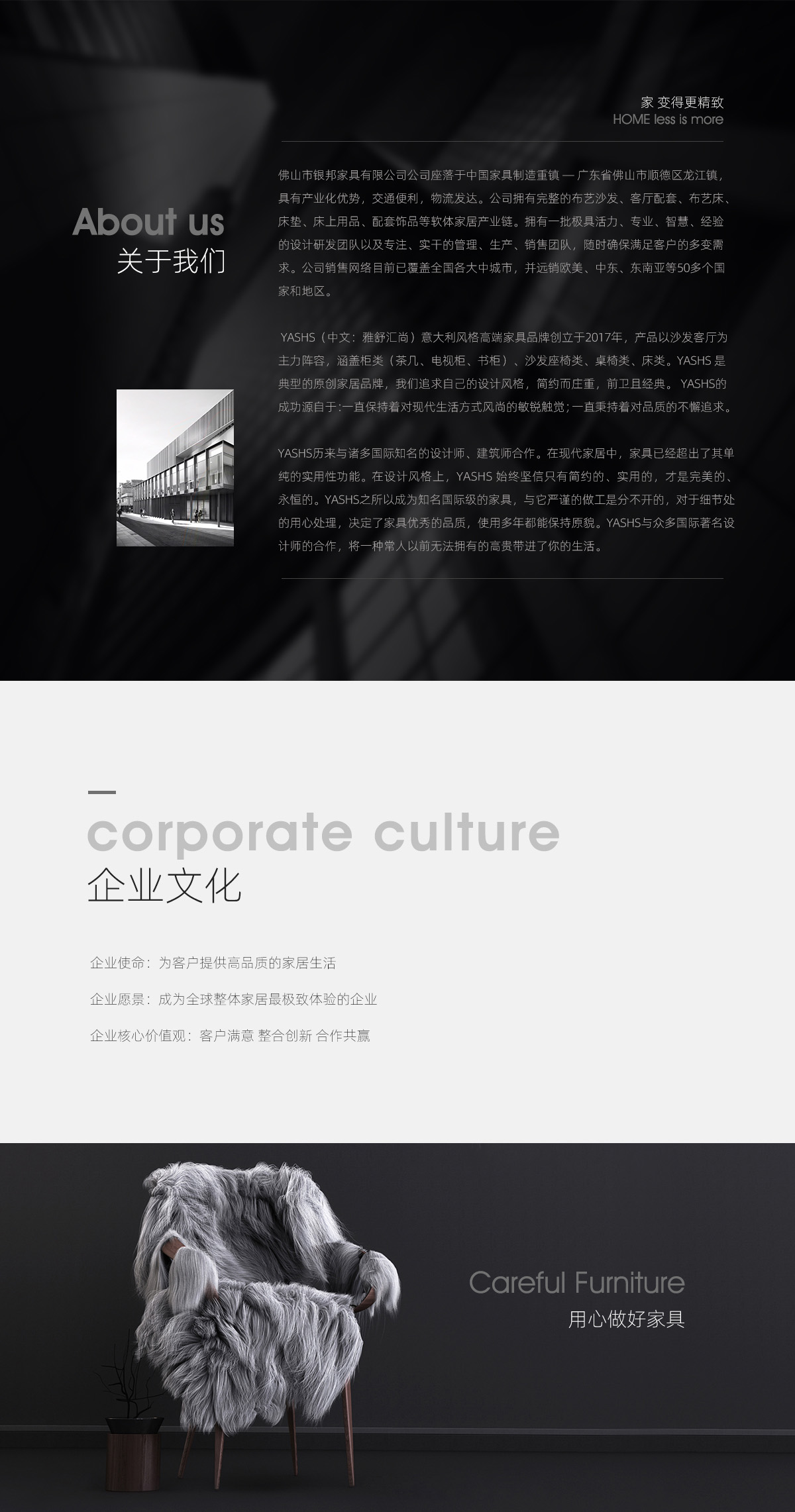 YASHS(中文:雅舒汇尚)意大利风格高端家具品牌创立于2017年,产品以沙发客厅为主力阵容,涵盖柜类(茶几、电视柜、书柜)、沙发座椅类、桌椅类、床类。YASHS 是典型的原创家居品牌,我们追求自己的设计风格,简约而庄重,前卫且经典。YASHS的成功源自于:一直保持着对现代生活方式风尚的敏锐触觉;一直秉持着对品质的不懈追求。